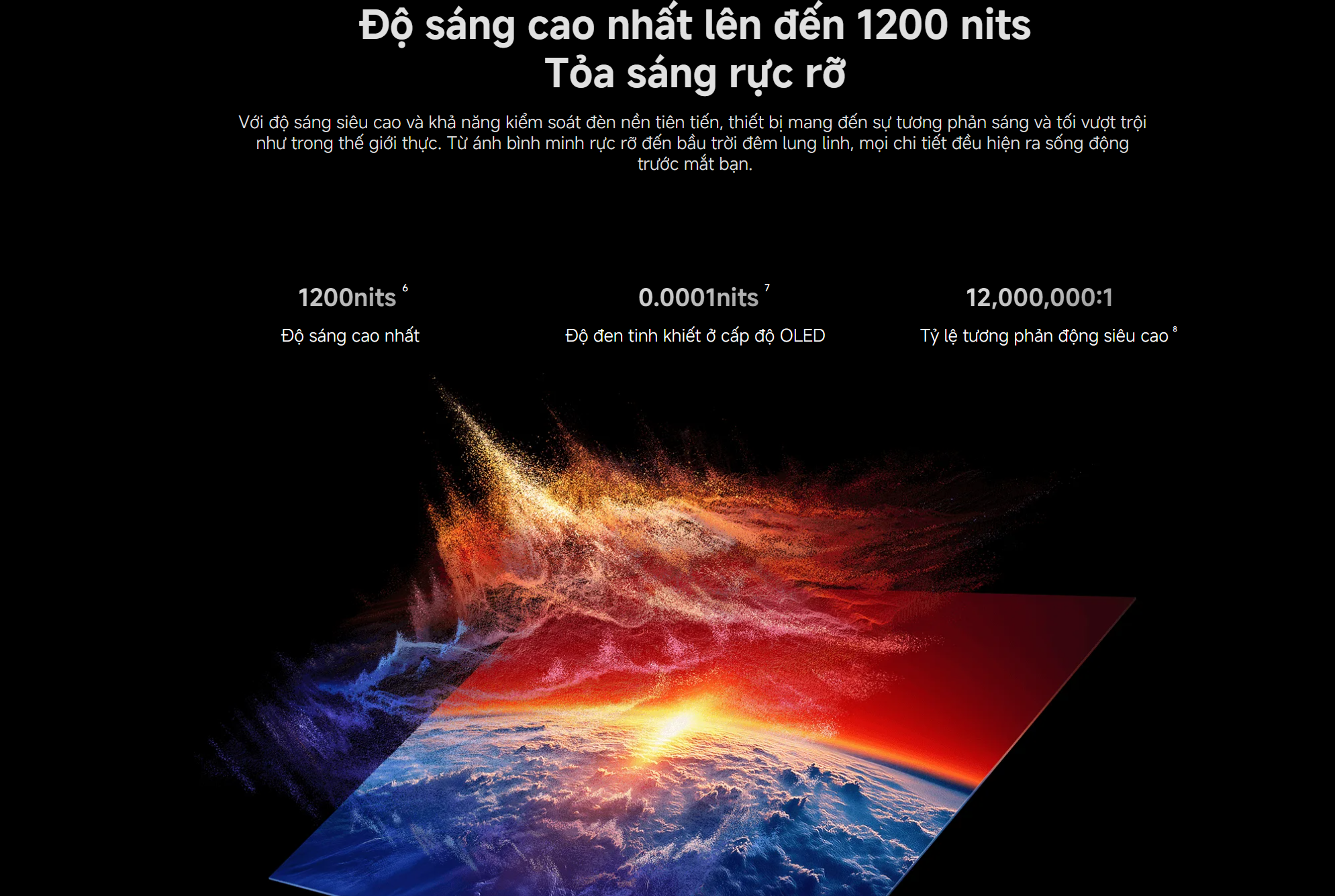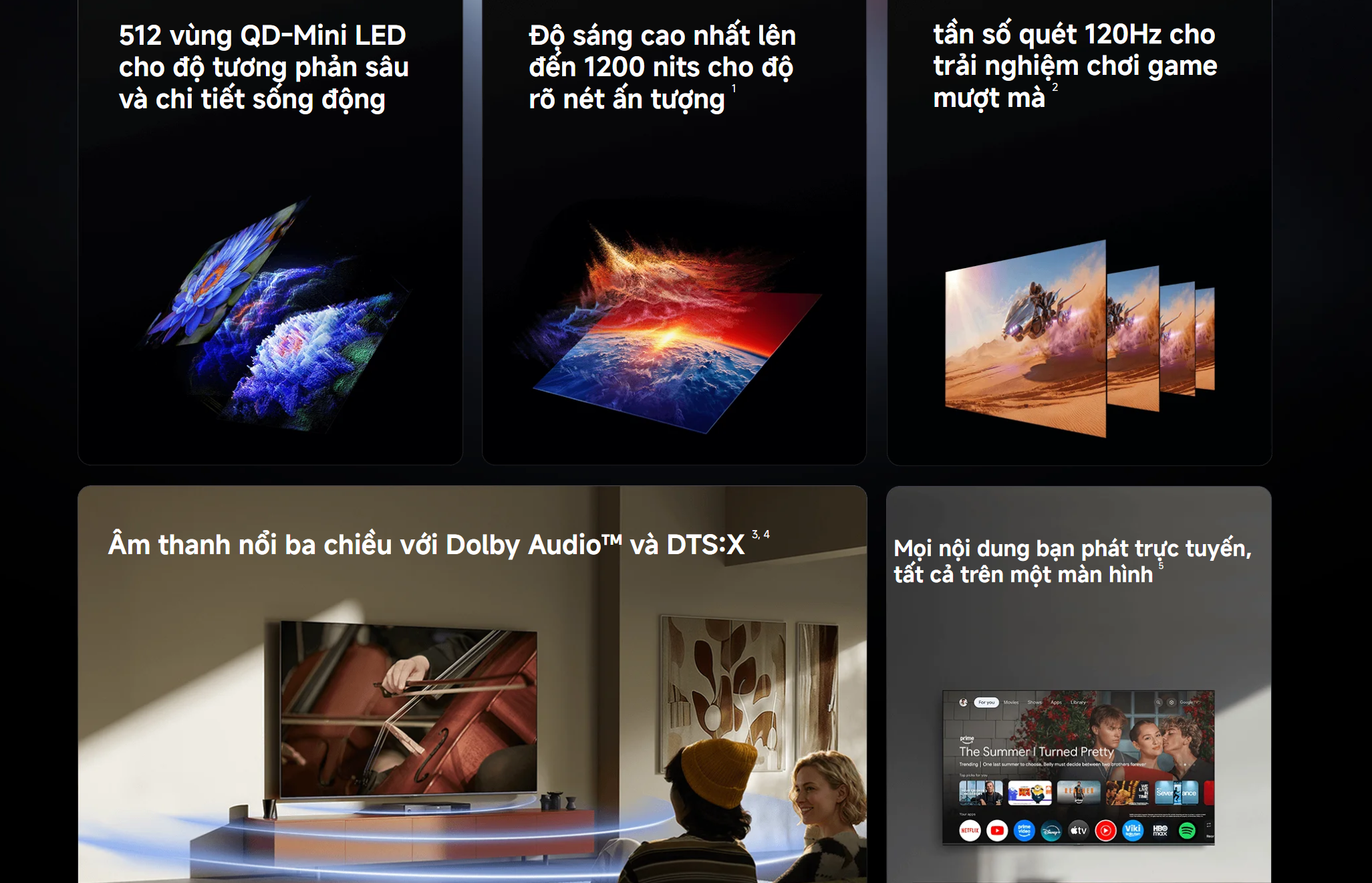 Độ sáng tối đa đạt 1200 nits giúp TV hiển thị rõ ràng trong môi trường nhiều ánh sáng và tái tạo nội dung HDR một cách ấn tượng.