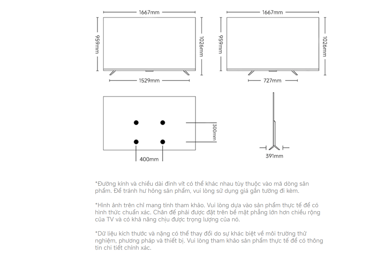 TV hỗ trợ treo tường chuẩn VESA 400 x 300mm. Trọng lượng đóng gói khoảng 32.1kg, thuận tiện cho việc vận chuyển và lắp đặt.